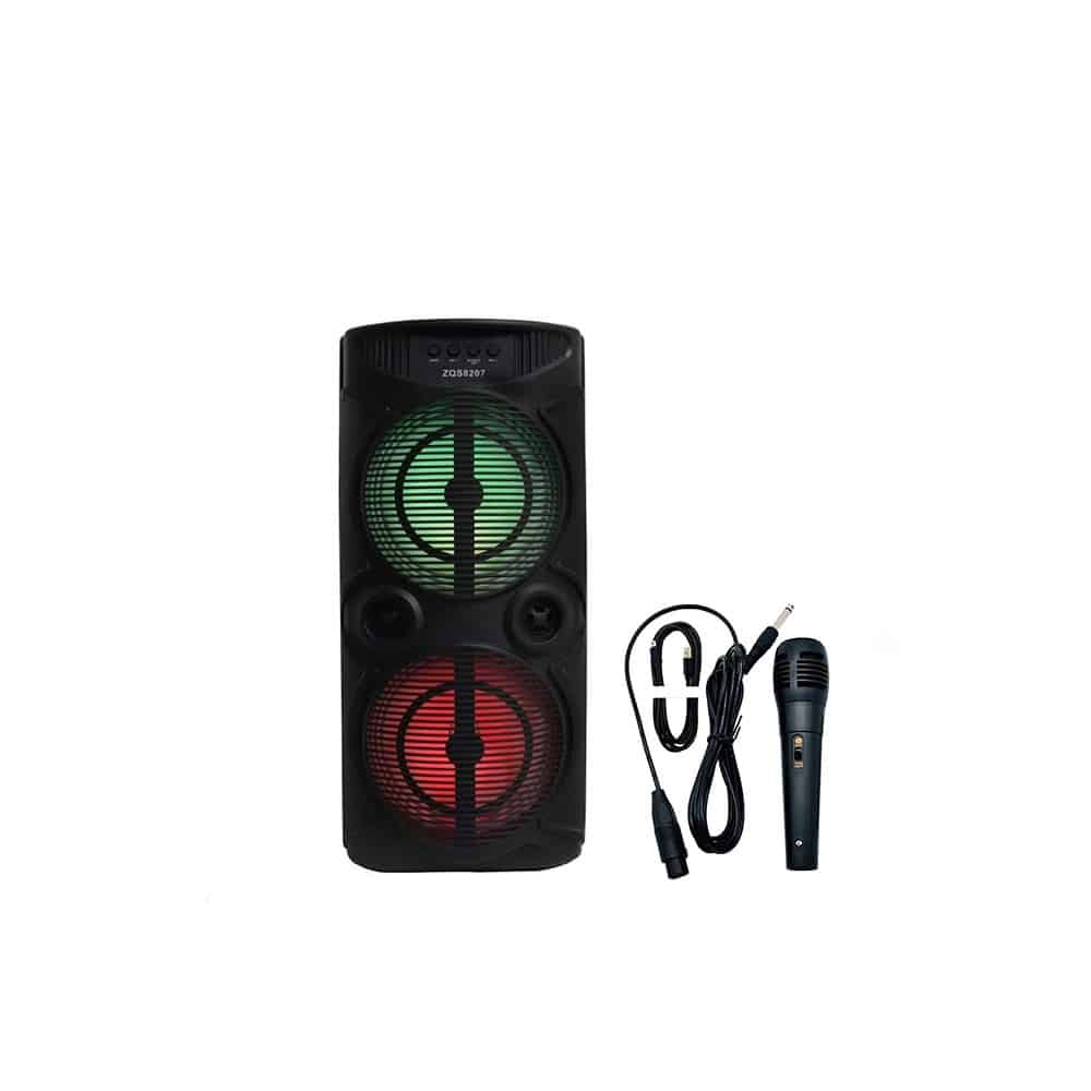 Le ZQS8207 est un haut-parleur 2.0 doté d’interfaces de connexion Bluetooth, USB, MicroSD, AUX, FM. La puissance du haut-parleur est de 12 W. L’appareil se distingue par la présence d’un rétroéclairage LED, d’un microphone et d’une fonction TWS (synchronisation de deux haut-parleurs à un système stéréo via Bluetooth). Il est alimenté par une batterie intégrée de 3000 mAh.