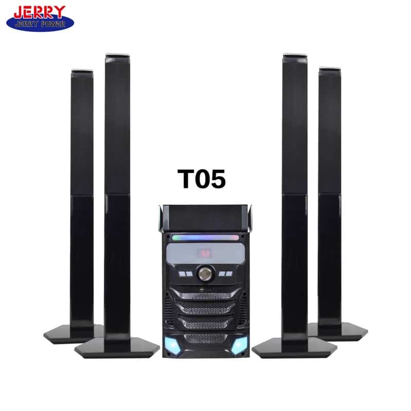JERRY 5.1 JR-T05 haut-parleur maison entrée optique Bluetooth système de son home cinéma riche en fonctionnalités, une variété de motifs sonores: Rock, classique, basse, Live, Normal. Nouvelle unité de haut-parleur plus forte fréquence de 3 pouces, qualité sonore supérieure; perle particulièrement couleur, avec la couverture anti-poussière unique de forme de balle et très dynamique.