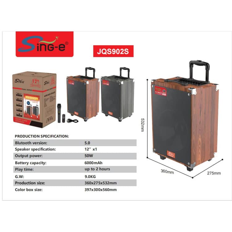 Le Haut-Parleur Bluetooth SING-E JQS-902S est une enceinte portable moderne, conçue pour offrir un son puissant et clair grâce à sa technologie de pointe. Compacte et élégante, elle se connecte facilement à vos appareils via Bluetooth, permettant une utilisation simple et sans fil. Sa batterie rechargeable assure plusieurs heures d’autonomie pour profiter de votre musique partout, que ce soit à la maison, en plein air ou lors de vos déplacements. Pratique et polyvalent, ce haut-parleur allie design, performance et confort d’utilisation pour enrichir toutes vos expériences musicales.