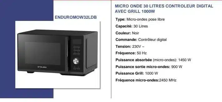 Le micro-ondes Enduro MOW32LDB est conçu pour offrir puissance, grande capacité et confort d’utilisation. Avec ses 30 litres, il est idéal pour les familles nombreuses ou pour ceux qui ont besoin d’un espace de cuisson plus important.Ce micro-ondes permet de réchauffer, cuire et décongeler rapidement tous types d’aliments. Grâce à son panneau de commande simple et intuitif, vous pouvez ajuster facilement le temps et la puissance selon vos besoins.