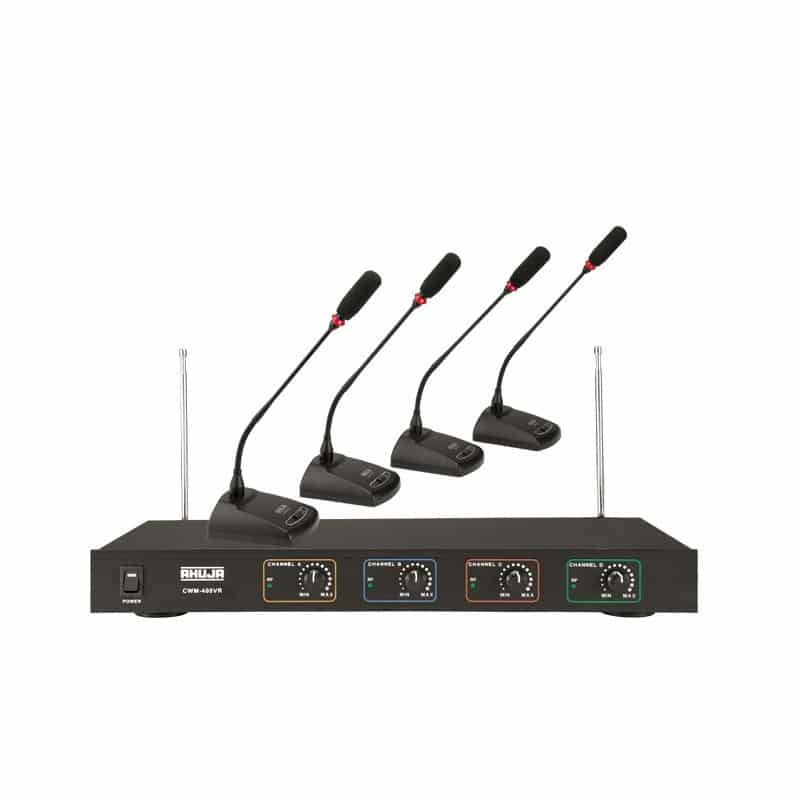 Se compose d’un récepteur sans fil VHF haute bande et de 4 nos. microphones col de cygne de table sans fil. Les microphones à col de cygne peuvent être placés sur un podium ou répartis sur une table de conférence, à une certaine distance du récepteur. La liaison sans fil entre les microphones à col de cygne et le récepteur permet une installation rapide et facile, et une immense flexibilité pour déplacer la position des microphones selon les besoins.